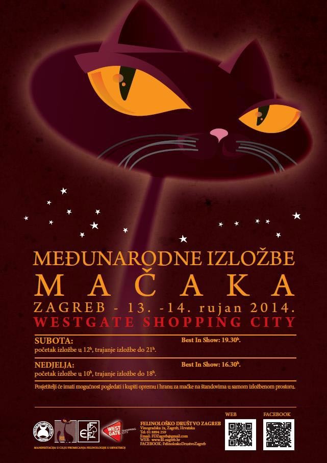International Cats Show Zagreb will be held at the Westgate shopping city. It is organized by Felinološko društvo Zagreb. Visitors will be able to watch and buy cat equipment and food at the booths during the show.
